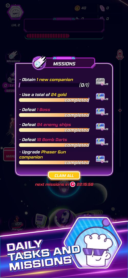 Keep collecting currency to obtain power ups for your ship and companions to progress!